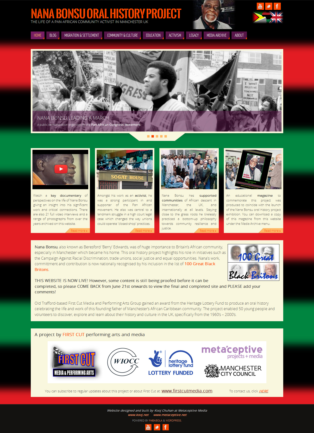 - Home Page – this is a snapshot of the content that is on the website, as well as creating a portrait reflecting Nana’s life and work. It uses a graphic magazine-style format including an image slider so that there are 9 image-links directly from the home page to key parts of the website plus the link to the 100 Great Black Britons website.